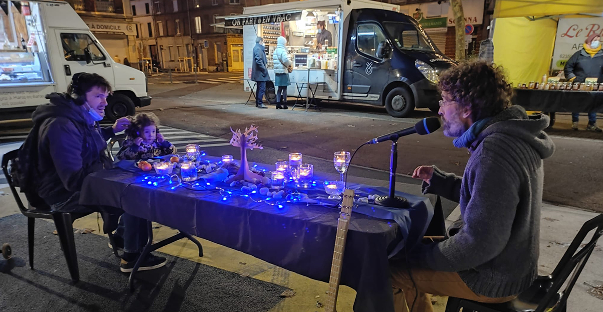 Prenez un micro, quatre casques, un conteur et sa guitare, mélangez le tout et vous obtiendrez une bulle sonore propice à l’écoute de contes d’ici, de là-bas et d’ailleurs.